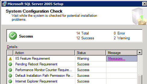 Installern bör nu ge grönt ljus gällande IIS och förutsatt att alla andra kontroller också ser bra ut bör du komma vidare i din installation. Glöm inte att applicera (minst) SQL 2005 SP2 direkt efter installation då det krävs för Windows Server 2008.