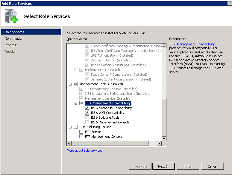 Problemet beror på att den IIS6 kompatibilitet krävs för SQL Server 2005 inte installeras om man bara godkänner IIS-installationens förvalda komponenter. För att installera de delar som SQL Server 2005 behöver väljer du att administrera IIS i Server Manager och lägger till följande Role Services: