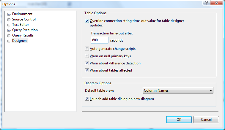 Om du får timeout när du försöker uppdatera en tabell i SQL Server Management Studio fastän du ställt upp både time out på både servern och på klienten så beror det på att det finns ytterligare ett timeoutvärde satt som gäller just för designläget. Inställningar för detta hittar man under ”Tools->Options->Designers”, som bilden nedan visar.