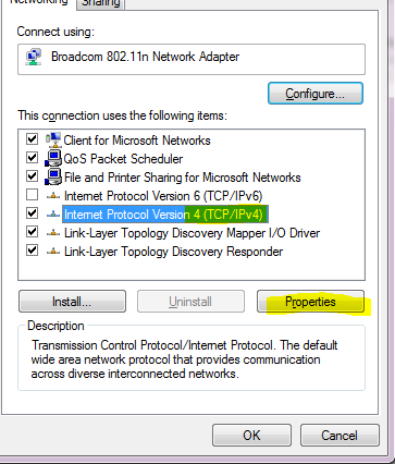 För att ställa in sekundär DNS i Windows 7 går du först till kontrollpanelen, väljer nätverksinställningar, klickar på länken till vänster i rutan som heter Ändra adapterinställningar. Därefter högerklickar du på det nätverkskort som du surfar genom (vanligtvis trådlös uppkoppling), välj Egenskaper.