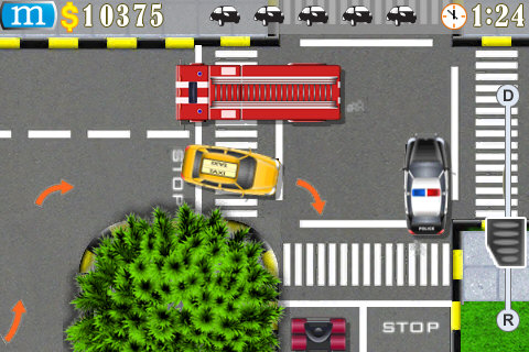 Parking Mania har riktigt skön styrning där man använder accelerometern för att styra och en slider på skärmen för att steglöst gasa och bromsa. Jag är extremt allergisk mot styrkontroller på skärmen, men en gas-/bromsslider är tillräckligt lätt att pricka och funkar väldigt bra. Det finns 30 nivåer och de blir roligare ju högre upp man kommer. En av de stora behållningarna tycker jag är att alla fordon beter sig väldigt verklighetstroget. De olika bilarna har olika svängradie och det lönar sig verkligen att krypa runt ett hörn när det blir ont om utrymme. Ett av mina favoritfordon är bussen (som tyvärr bara är med på en nivå), den har en otroligt skön rotationspunkt i och med längden och att fram hjulen sitter bakom föraren. Man måste göra svängar där man tar ut ordentligt i mötande fil och det känns som om man har åkt för långt innan man börjar svänga – precis som i verkligheten.