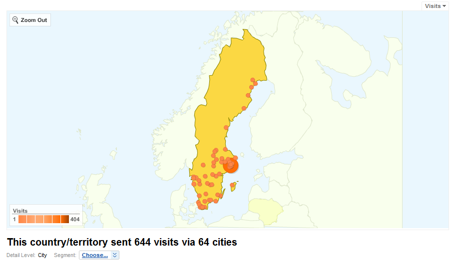 Mina två favoritfunktioner i Google Analytics är Map Overlay och Site Overlay. Map Overlay visar ner på stadsnivå varifrån dina besökare kommer i världen. Site Overlay visar din site och lägger ovanpå ett lager med diagram över vilka länkar besökarna klickar mest på.