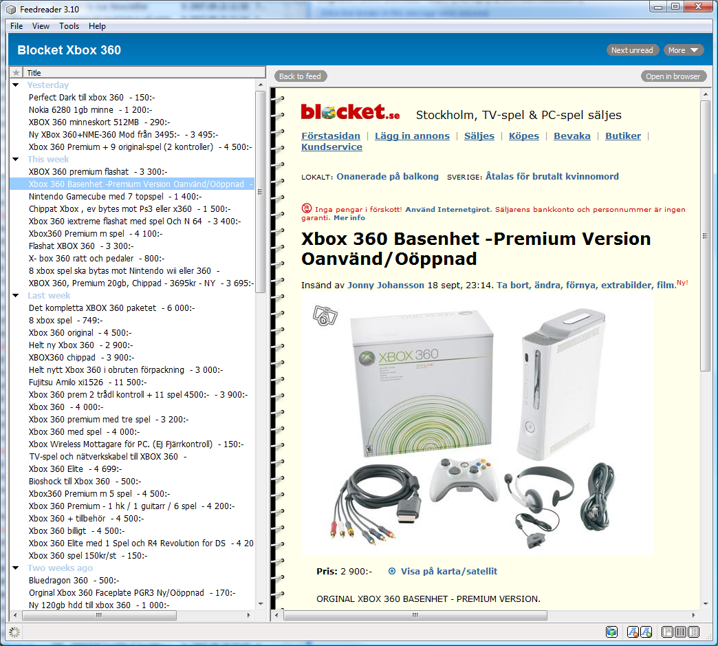 Att Sveriges största annonsmarknad, Blocket, saknar RSS-bevakningar är något som jag stört mig på länge. Som tur är verkar några utvecklare ha stört sig på samma sak och tagit saken i egna händer. Resultatet är en mycket väl fungerande RSS-bevakarare som man själv kan skräddarsy: den ännu ganska sparsmakade somrss.se. Dock kan man ännu inte kombinera fler sökningar i samma RSS, men det är ett mindre problem om man har en bra RSS-läsare.