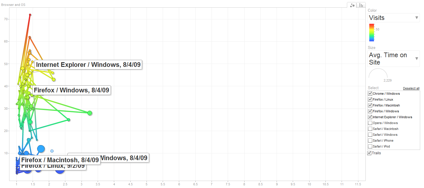 En traditionellt svår nöt att knäcka är hur man visar flerdimensionell data på en skärm som är två dimensioner. Google Analytics har löst detta genom en graf som de kallar Motion Charts. Motion Charts kan visa data i fem dimensioner: