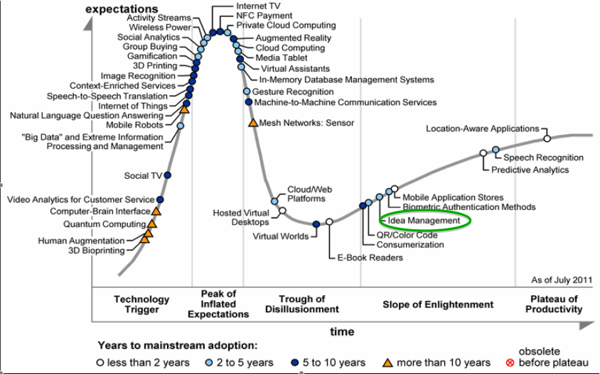 Som investerare/beställare av teknik gör man oftast bäst att vänta på att en teknik har passerat sin värsta hype och investera lagom till att tekniken är på väg upp i sin mogna fas. Här kommer några axplock från den senaste publicerade kurvan från augusti 2011 och vi börjar med några som har passerat igenom sitt värsta fall och nu är påväg att bli mogna;