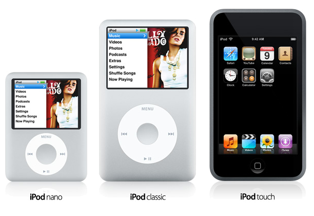 - iPod Classic - en modell som ser ut som den första, vita iPoden som kom, men uppdaterad med video och en hårddisk på upp till 160 GB.