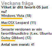 En jämn omröstning skulle jag säga. Förhållandet Vista/Leopard avspeglar ganska väl försäljningssiffrorna som senast jag såg dem låg ganska lika. Att det är lite Vista-övertag här är kanske inte så konstigt - vi skriver ju mycket om .NET och andra Microsoft-tekniker.