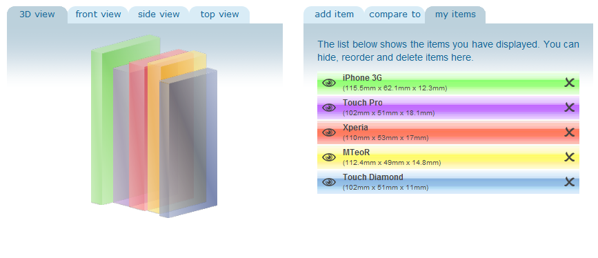 När man har matat in ett gäng objekt man är nöjd med kan man spara jämförelsen som då får en egen adress, som den ovan: http://www.sizeasy.com/page/size_comparison/14707-iPhone-3G-vs-Touch-Pro-vs-Xperia-vs-MTeoR-vs-Touch-Diamond. Man kan också titta på andras jämförelser - jag kan skvallra om att jämförelser med iPhone är ganska populära.