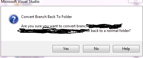 När du gjort detta och uppdaterar försvinner grenen från source control men stället du skapade grenen ifrån är fortfarande markerad som gren. För att ta bort denna markering väljer du mappen i Source Control Explorer och väljer Source Control, Branching and Merging, Convert To Folder.