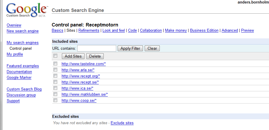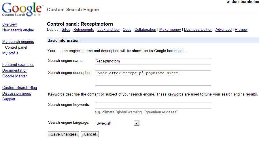 Med Google Custom Search Engine kan du koka ihop en egen sökmotor, som alltid söker efter vissa ord eller som bara söker på siter du har valt ut. Om man t.ex. vill göra en sökmotor för recept som söker på några svenska siter gör man såhär: