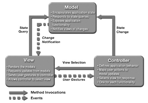 Arkitekturen Model - View - Controller, oftast förkortad MVC, uppfanns redan 1979 under arbetet med programspråket Smalltalk. Grundidén är (precis som med många andra arkitekturer) att tydligt separera presentation, affärslogik och data från varandra. Såhär fungerar MVC (ursäkta lite svengelska här och var):