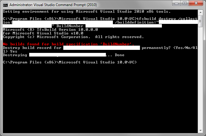 tfsbuild destroy tar bort det som finns kvar av det gamla borttagna bygget och man kan sedan starta ett nytt bygge.