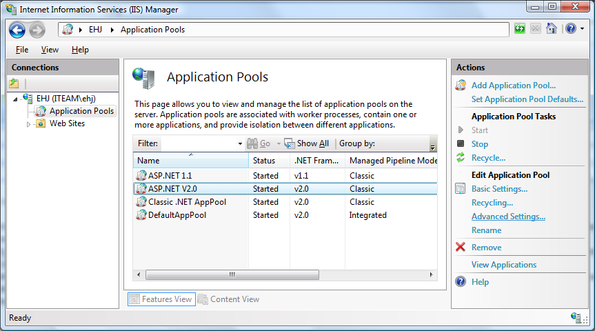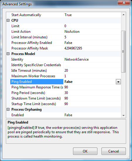 I båda fallen så skall man gå in och ändra på den AppPool som ens processer kör under. Markera AppPoolen och tryck på ”Advanced settings”. Under dessa inställningar kan man antingen stänga av funktionaliteten helt genom att sätta ”Ping Enabled” till ”false”, eller utöka värdet ”Ping Maximum Response Time”.
