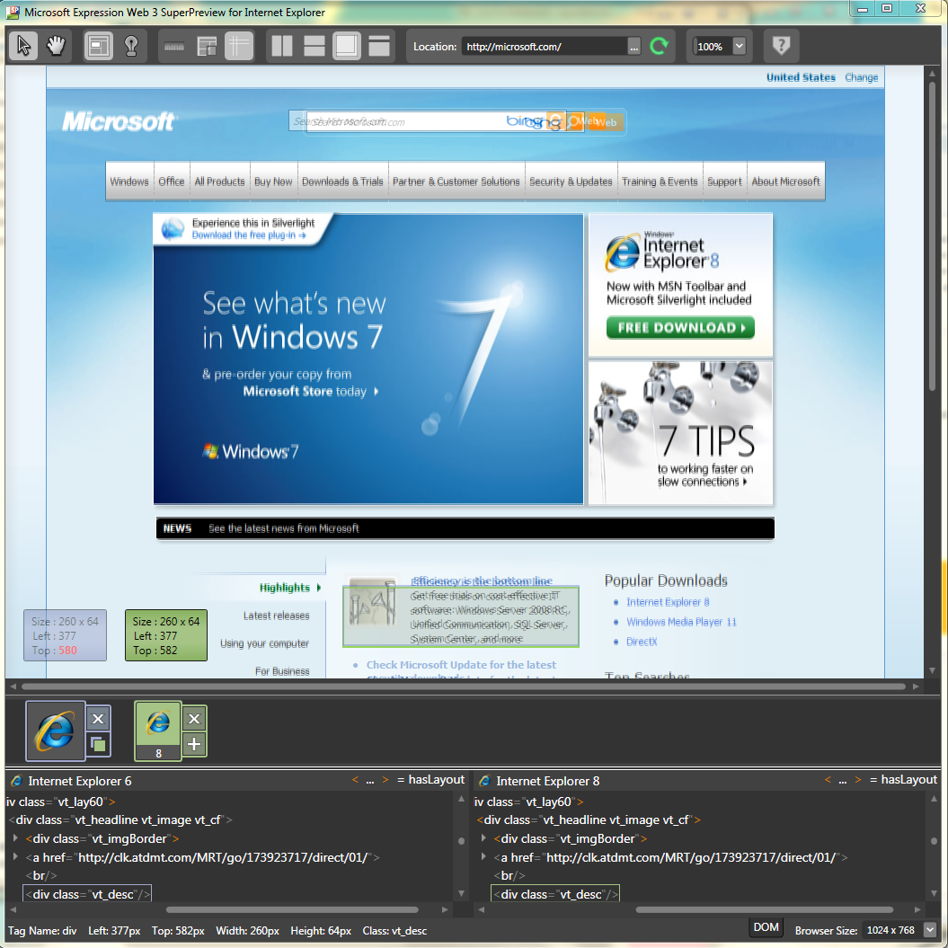 Det finns ju många sätt att testa flera versioner av webbläsare, bland annat onlinetjänster så som BrowserShots.com och också program som IETester vilket vi bloggat tidigare om, men den snyggaste är faktiskt byggd av Microsoft och heter det fantasifulla namnet ”Microsoft Expression Web 3 SuperPreview for Internet Explorer”, man kan ju dock benämna det som SuperPreview för enkelhetens skull ;).